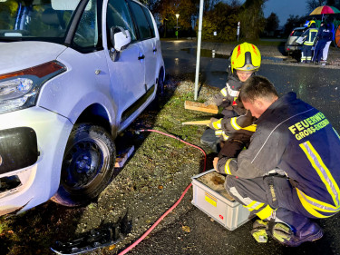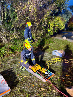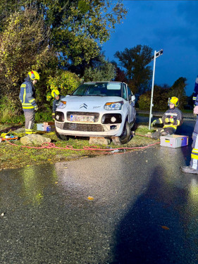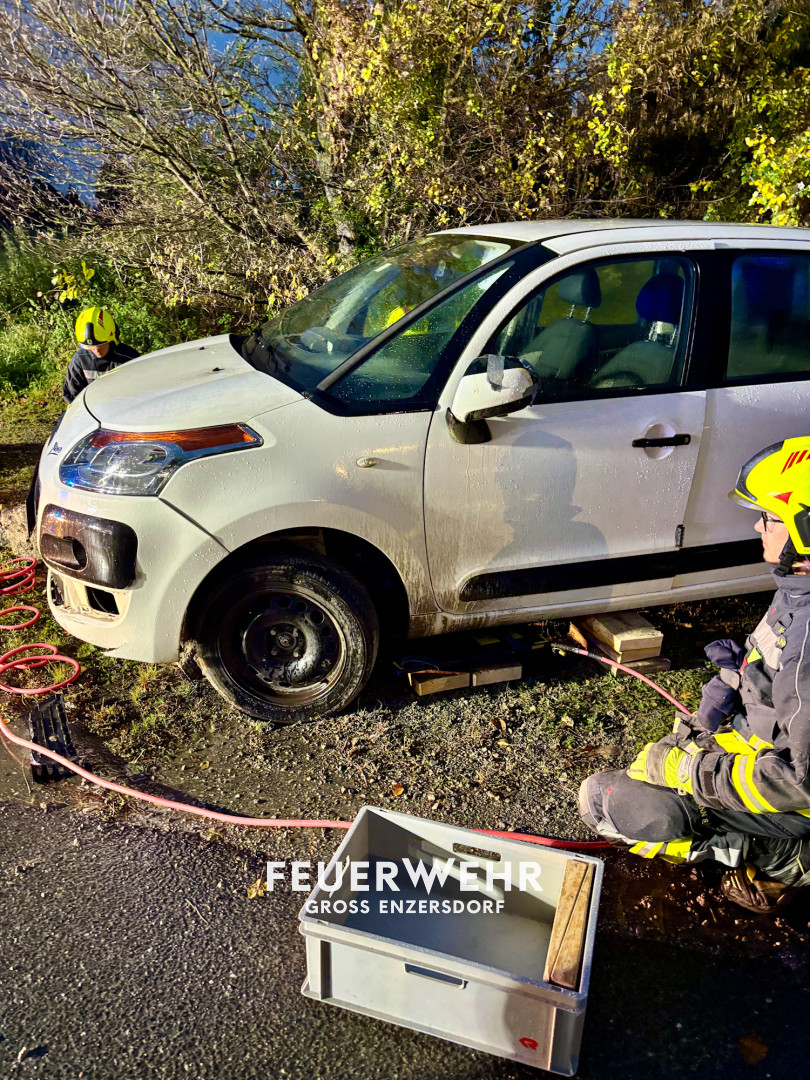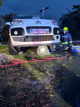 Nach unserer Ankunft wurde der Pkw mit Hebekissen links und rechts so weit angehoben, dass der Stein vorsichtig herausgerollt werden konnte. Anschließend konnte das Fahrzeug ohne sichtbare größere Schäden sicher am Straßenrand abgestellt und an den Besitzer übergeben werden.