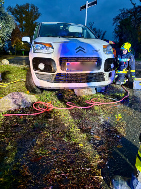 Eine ältere Person fuhr in einer Kurve etwas zu scharf ein und setzte mit dem Fahrzeug auf einen Begrenzungsstein auf, wo dieses schließlich zum Stillstand kam.