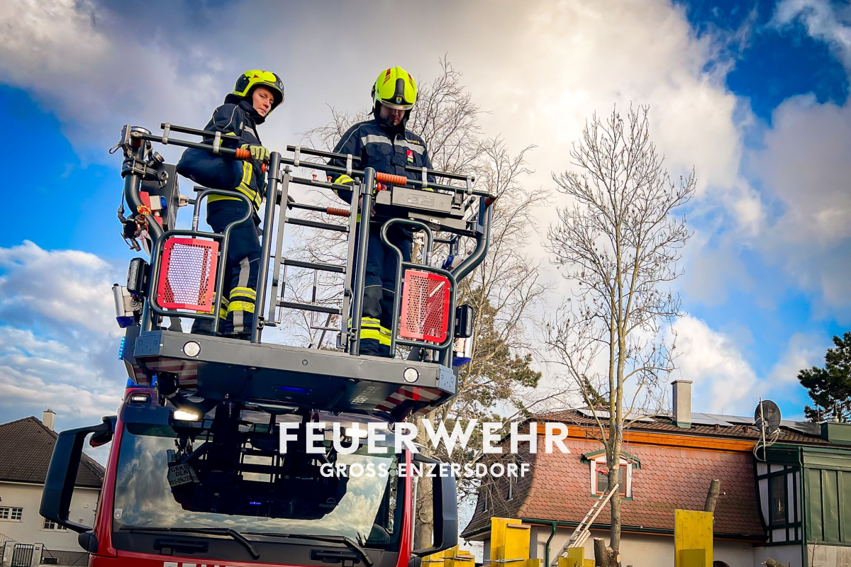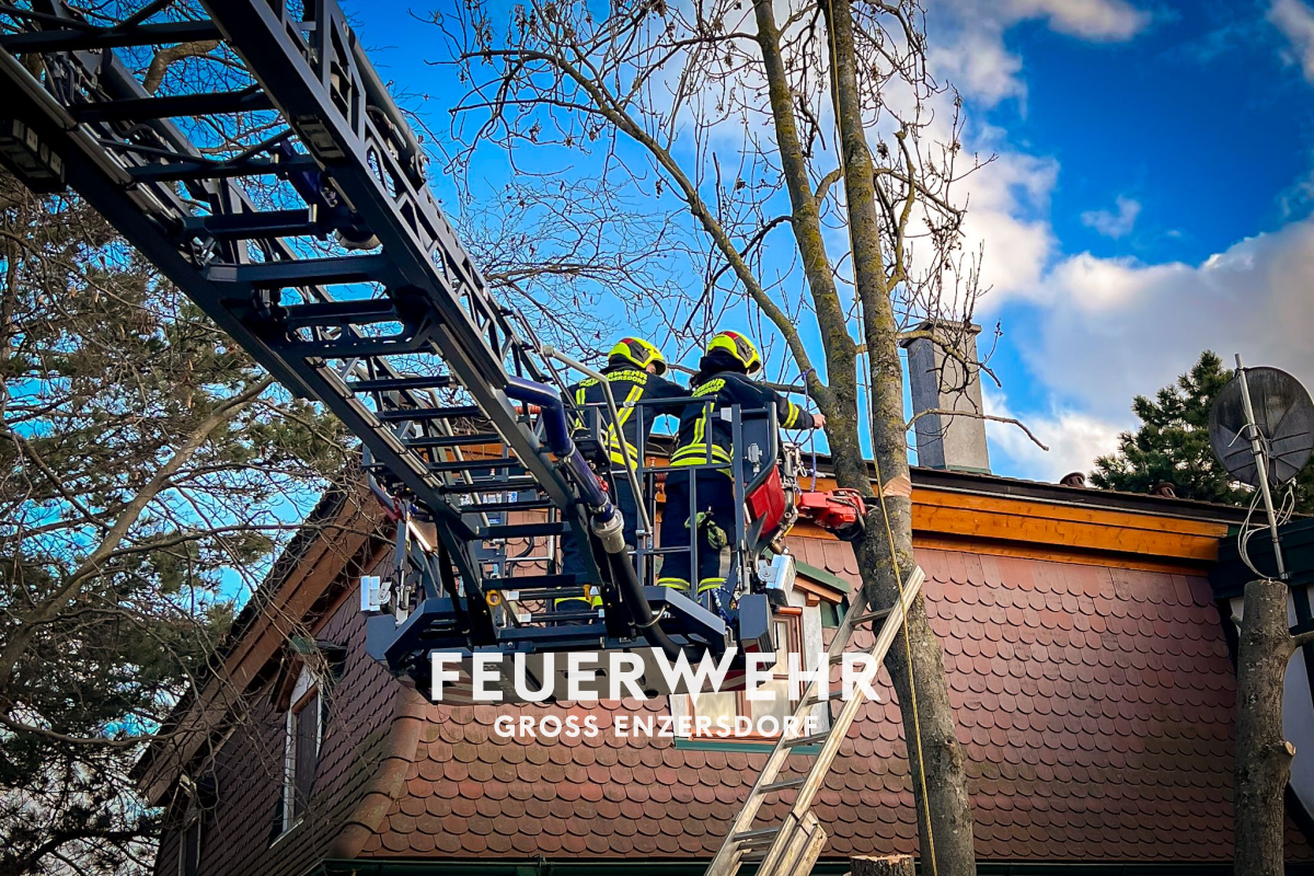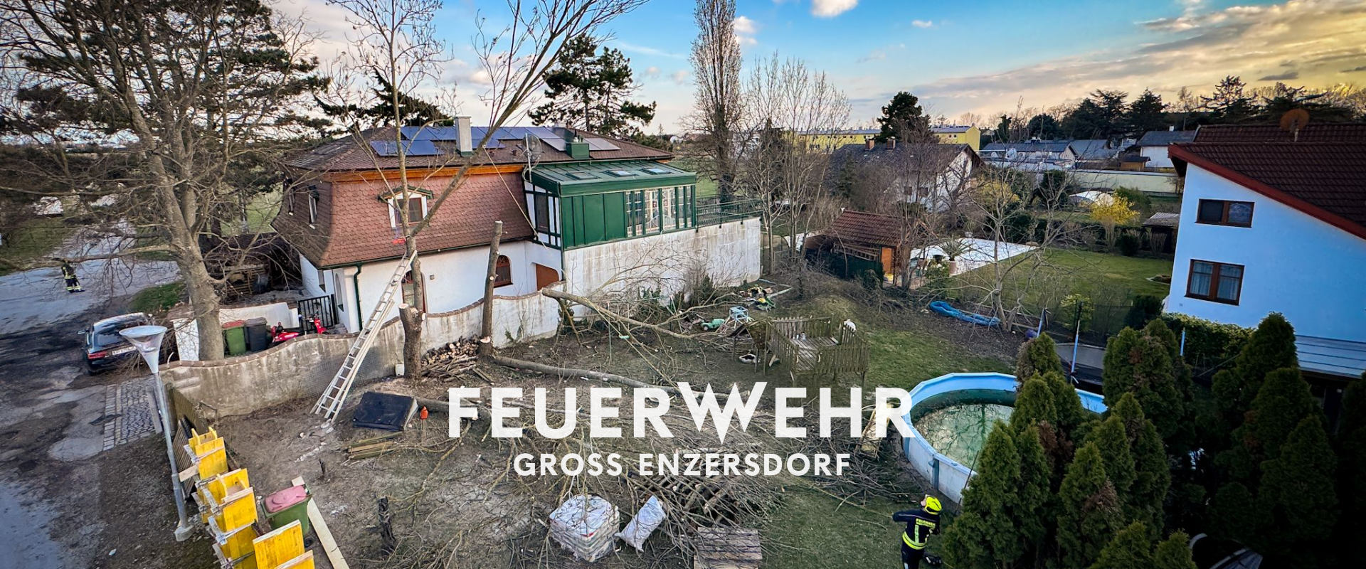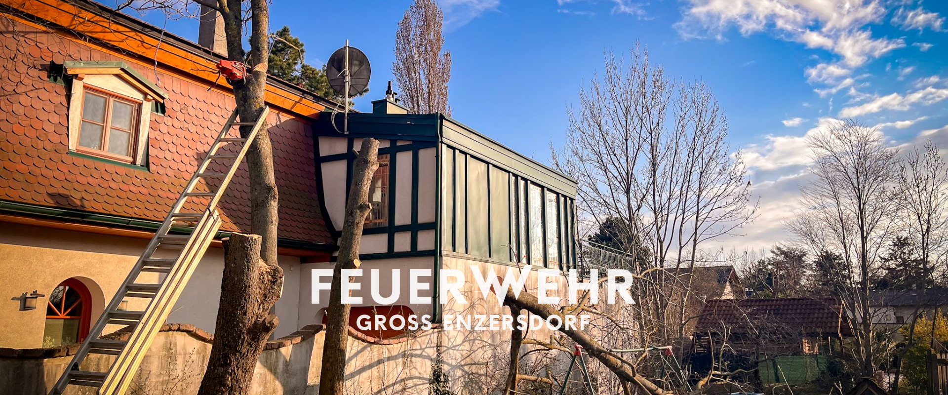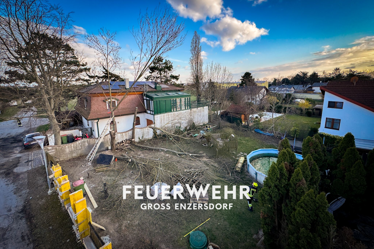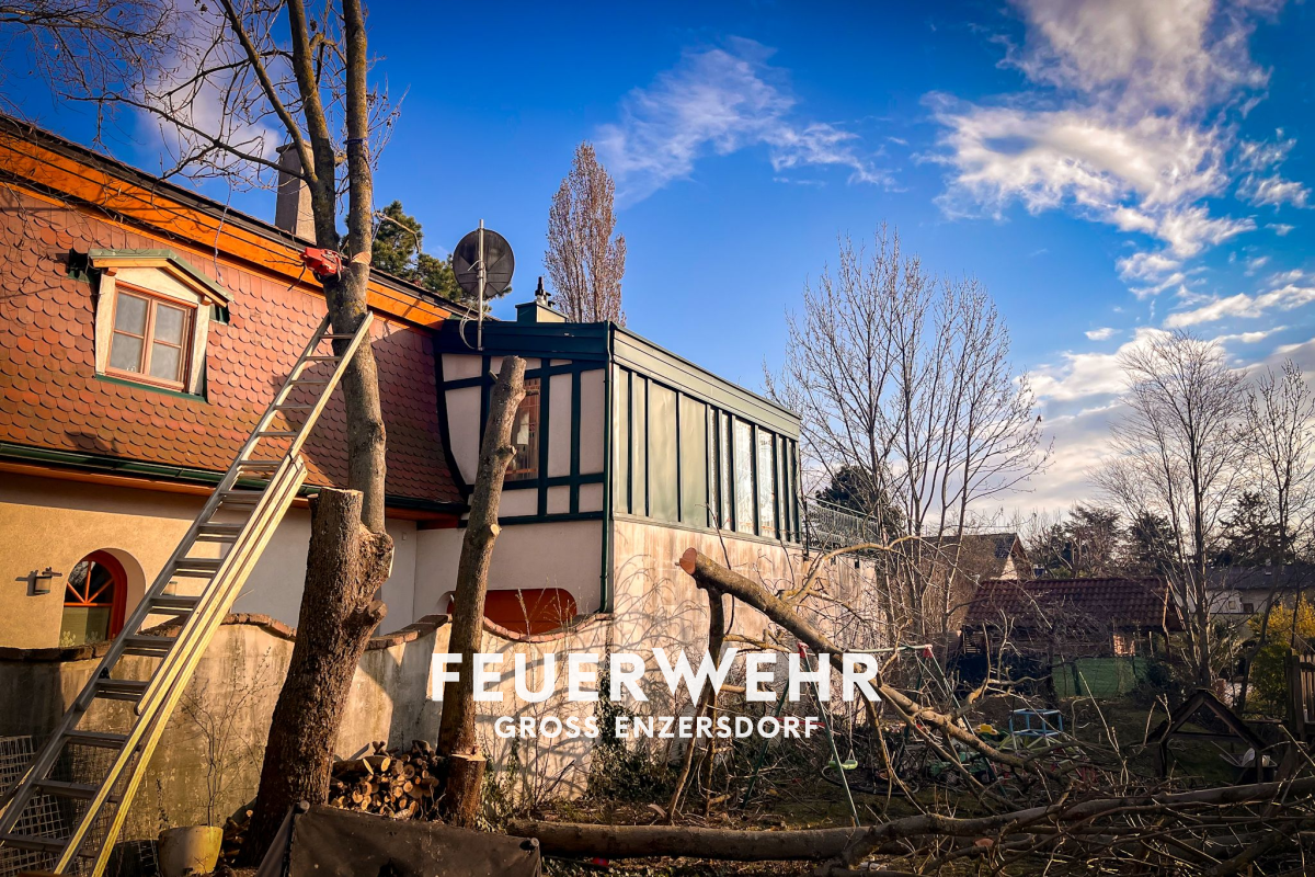 Beim Eintreffen am Einsatzort bot sich eine durchaus heikle Lage: Während bereits mehrere gefällte Bäume im Garten lagen, war ein rund acht Meter hoher Baum nur zur Hälfte angesägt. Die Kettensäge der Arbeiter blieb bei den Holzfällarbeiten im Stamm stecken und eine Sicherung war gerissen. Der Baum verkeilte sich in einer Astgabel und drohte auf ein benachbartes Gebäude zu stürzen.