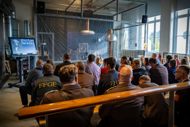 Ein weiteres Highlight war die Hochspannungsvorführung. In einem speziellen Sicherheitskäfig wurde eindrucksvoll gezeigt, wie Strom, mit extrem hoher Spannung, unter anderem Lampen ganz ohne Kabel zum Leuchten gebracht wurden und eindrucksvolle Blitze den Käfig durchzuckten.