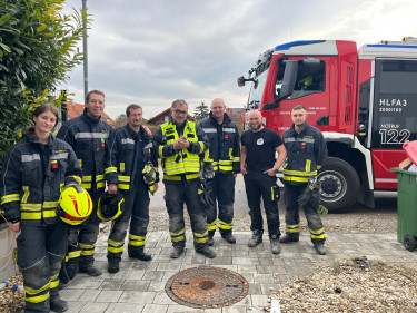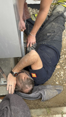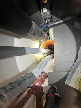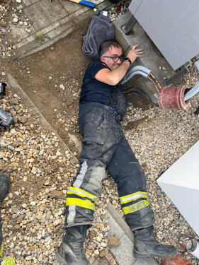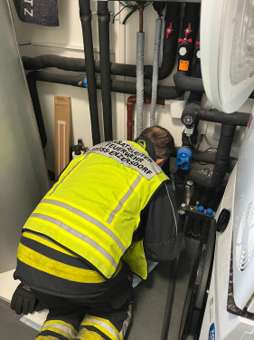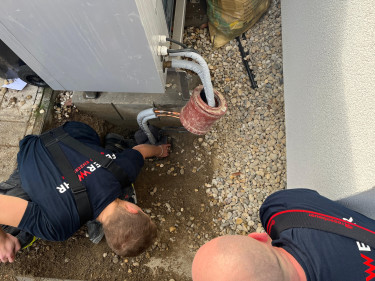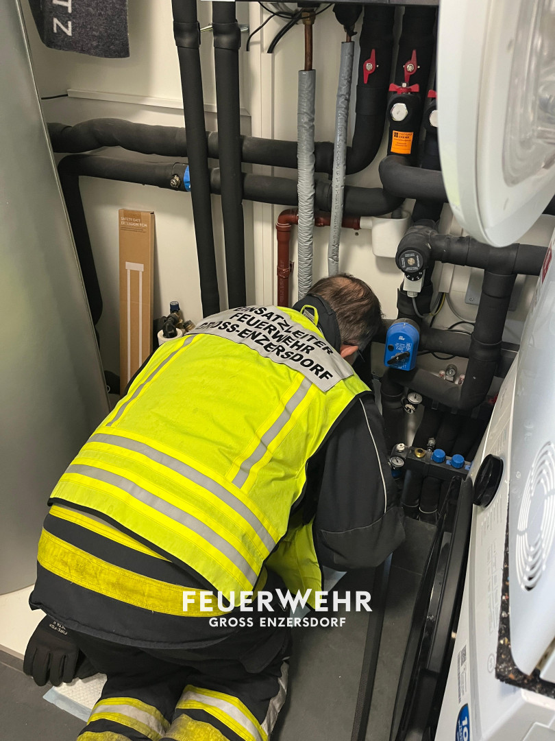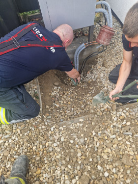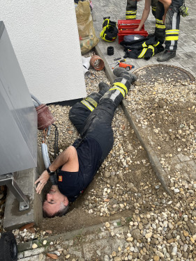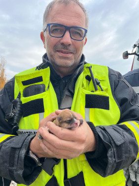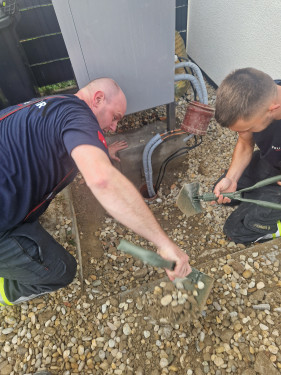 Am Einsatzort angekommen stellte sich heraus, dass ein erst zwei Tage alter Welpe in das Zuleitungsrohr einer Wärmepumpe geraten war und sich nicht mehr selbst befreien konnte.