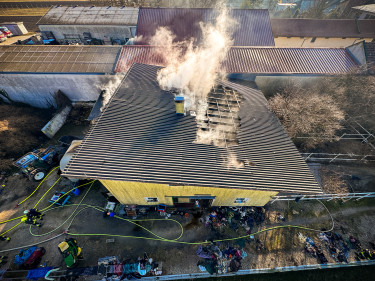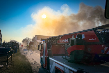 Um eine weitere Brandausbreitung zu verhindern, wurde umgehend ein umfassender Löschangriff der anwesenden Feuerwehren eingeleitet. In einem ersten Schritt wurde mit dem Wasserwerfer der Drehleiter (DLK) die angrenzende Halle geschützt, um ein Übergreifen der Flammen zu verhindern. Anschließend wurde der Dachbereich gezielt abgelöscht, um die Brandintensität zu reduzieren.