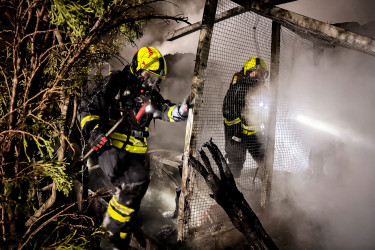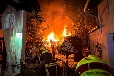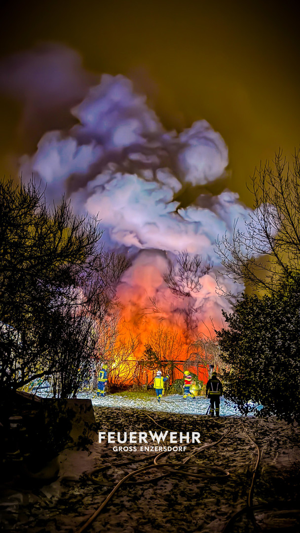 Bei unserem Eintreffen zeigte sich das volle Ausmaß der Brandtragödie. Eine große Holzvoliere, die zur Unterbringung von Zuchttauben diente, stand in Vollbrand. Ein Übergreifen der Flammen auf das angrenzende Nachbarobjekt sowie auf das dahinterliegende Waldstück stand unmittelbar bevor.
