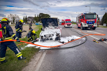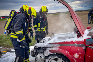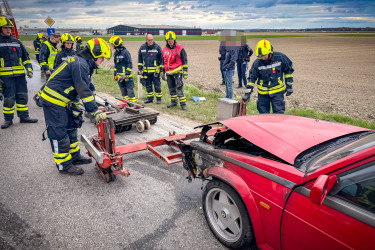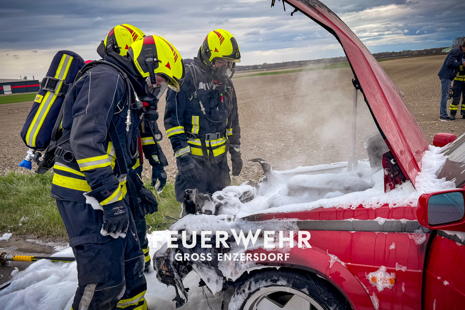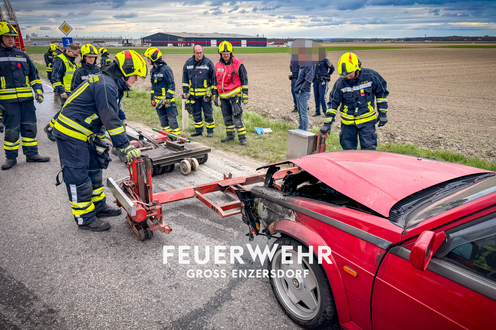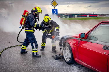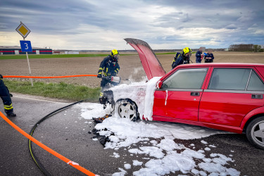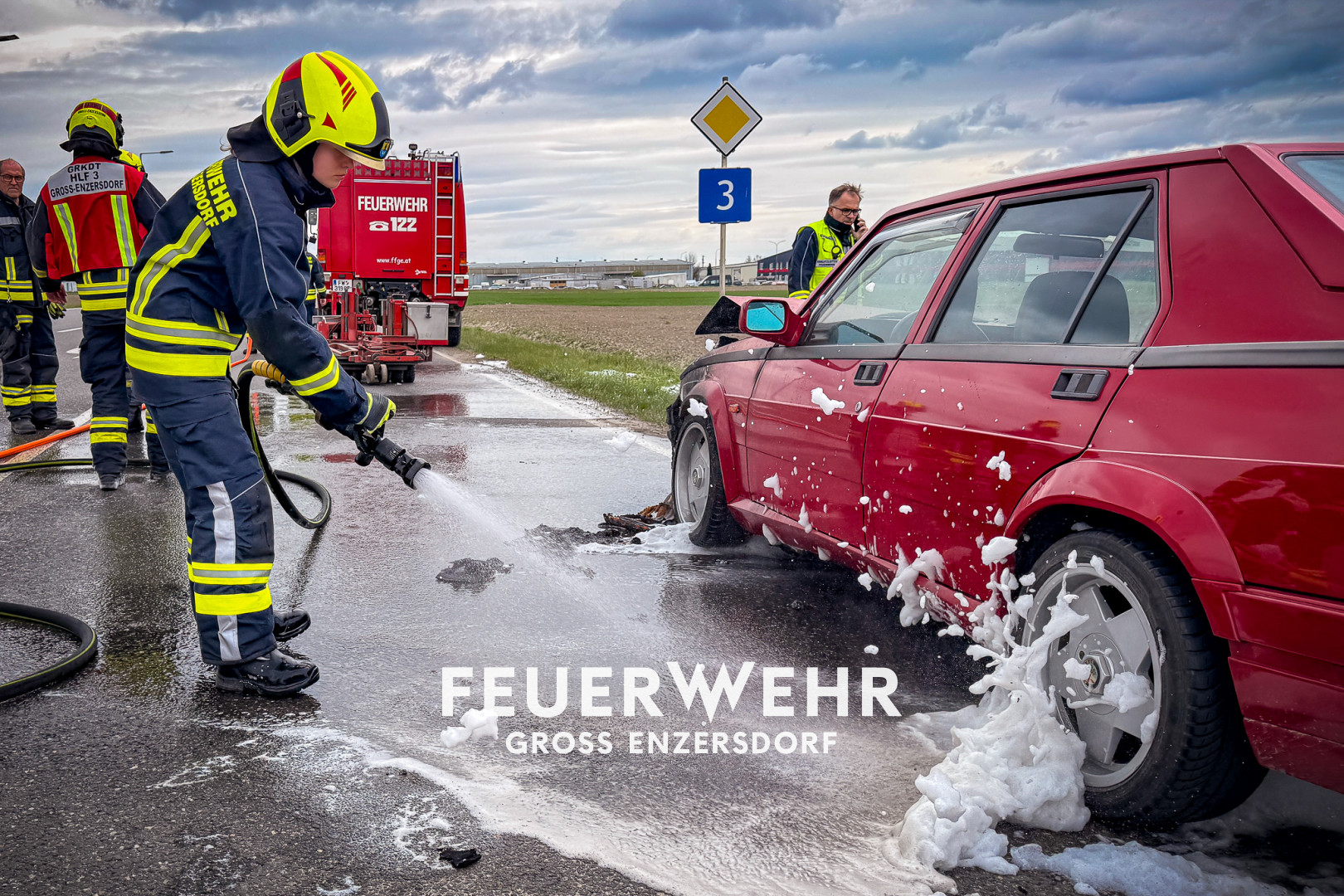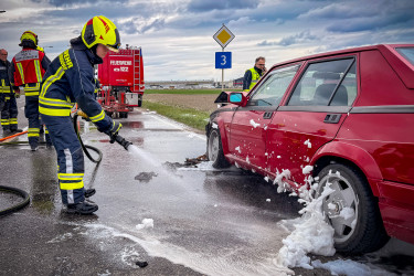 Kurz vor der Sirenenprobe wurden wir zu einem Fahrzeugbrand auf der B3, im Bereich der griechischen Taverne am Sachsengang, alarmiert. Bereits auf der Anfahrt war der brennende Pkw sichtbar, weshalb sich umgehend ein Atemschutztrupp ausrüstete. Aus bislang ungeklärter Ursache war der Motorraum eines Alfa Romeo auf der Fahrt zwischen Groß-Enzersdorf und Neuoberhausen in Brand geraten.